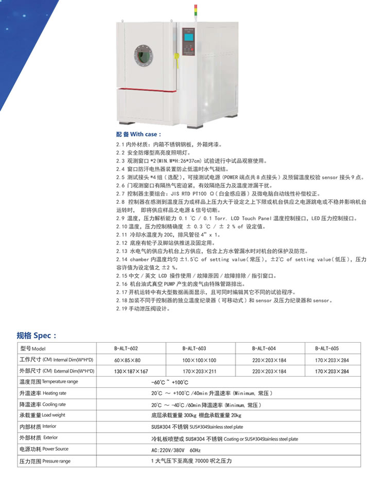 產(chǎn)品別名:高空低氣壓試驗(yàn)箱、高低溫低氣壓試驗(yàn)箱、海拔溫度濕度試驗(yàn)箱、高原環(huán)境氣候倉(cāng)、海拔溫度試驗(yàn)室、高低溫濕熱低氣壓試驗(yàn)箱、高低溫低氣壓試驗(yàn)機(jī)高空低氣壓試驗(yàn)箱應(yīng)用于對(duì)產(chǎn)品(整機(jī))、零部件、材料進(jìn)行高溫、低溫,高度(不高于海拔30000米或45000米)以及高低溫循環(huán)試驗(yàn)和溫度-高度綜合試驗(yàn),高、低溫試驗(yàn)時(shí)本試驗(yàn)箱可用于散熱試驗(yàn)樣品和非散熱試驗(yàn)樣品的試驗(yàn)。對(duì)于散熱試驗(yàn)樣品的試驗(yàn),其散熱功率不能超過試驗(yàn)箱制冷量,因制冷量為動(dòng)態(tài)值,其隨溫度點(diǎn)變化而有所變化。